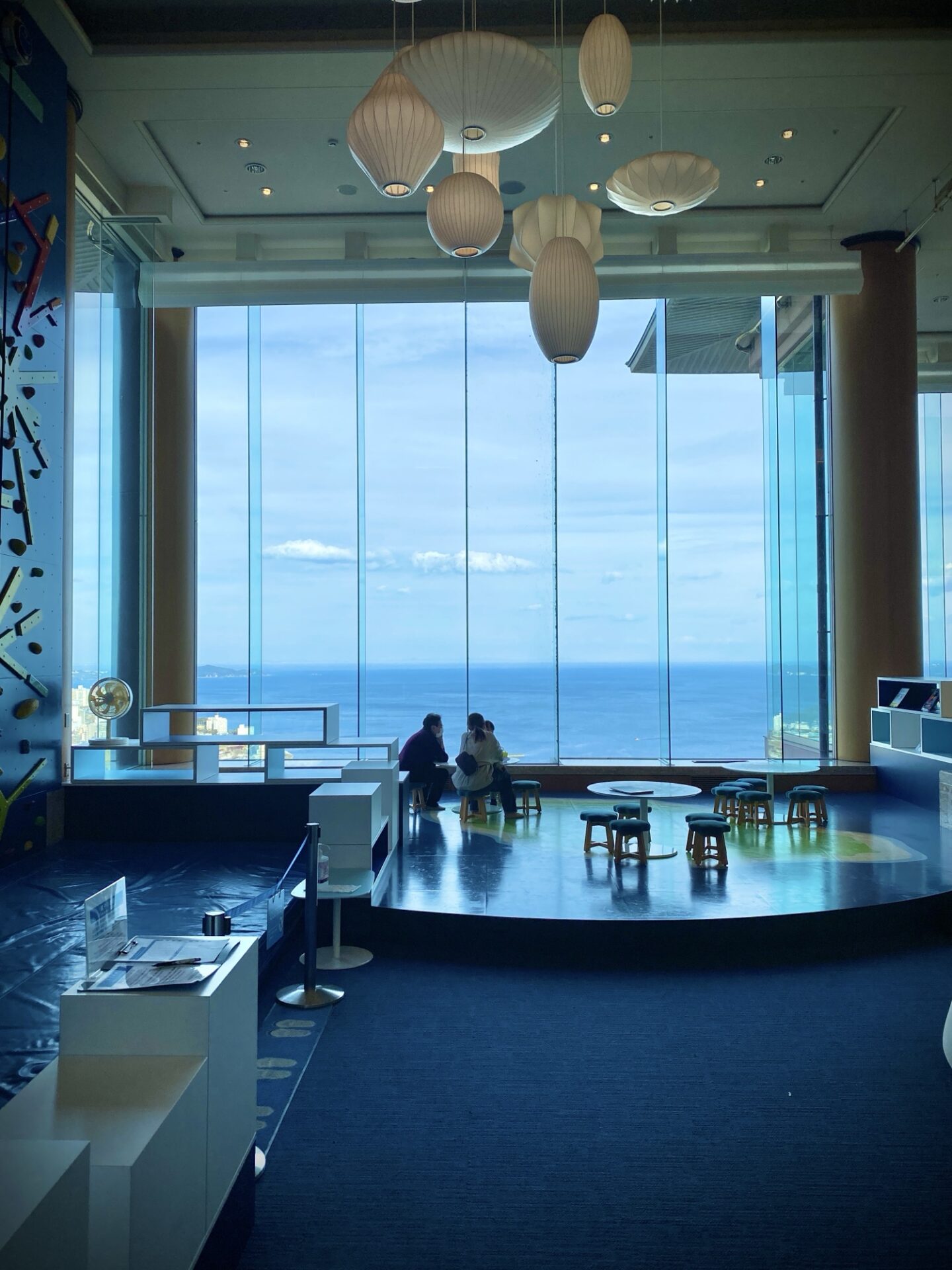 下には海を眺めらるお席も。その横にチラッと見えるのが目玉アクティビティの「クライミングウォール」です。