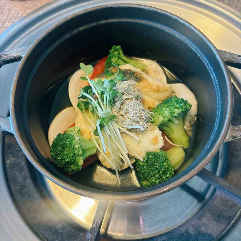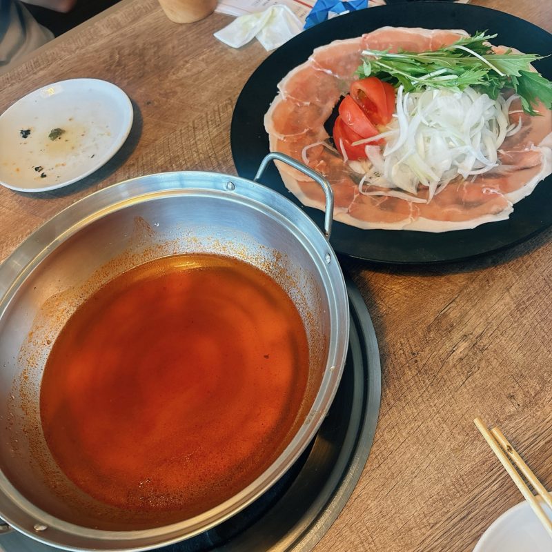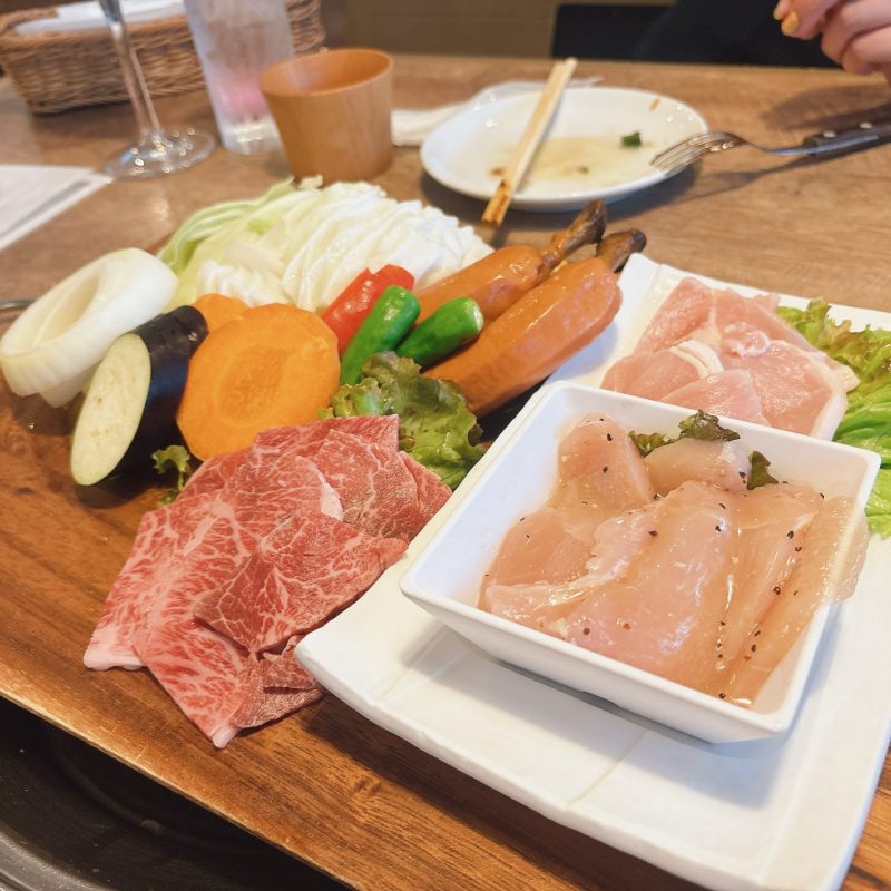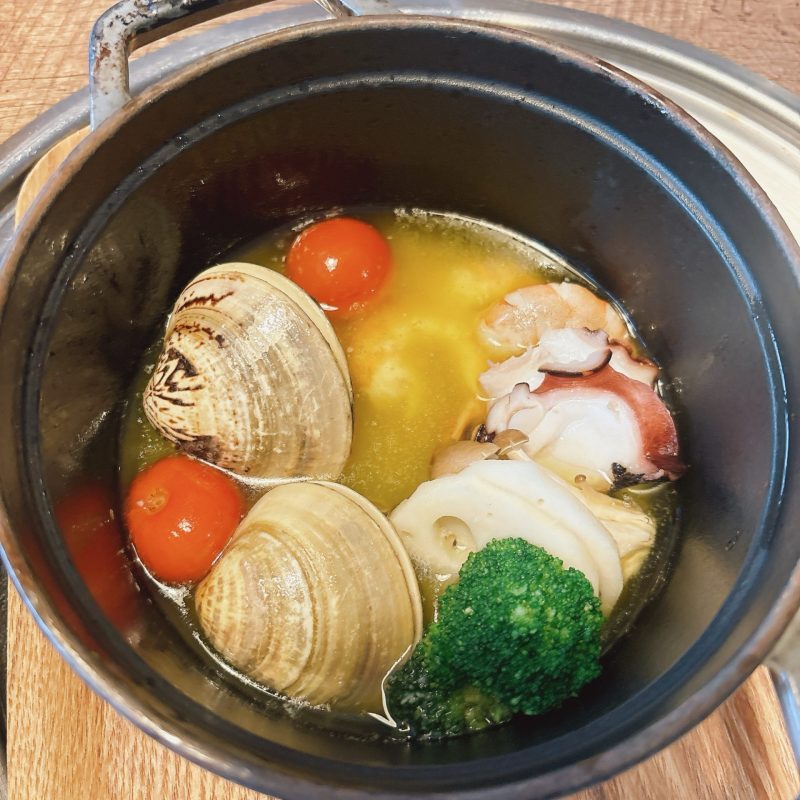 テーブルにはブイヨンスープの鍋が置かれており、具材を入れたらスープができるスタイル。