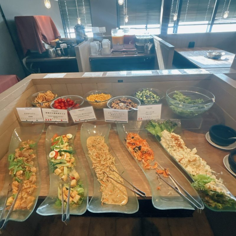 こちらはサラダ。奥にあるのがドリンクバー。