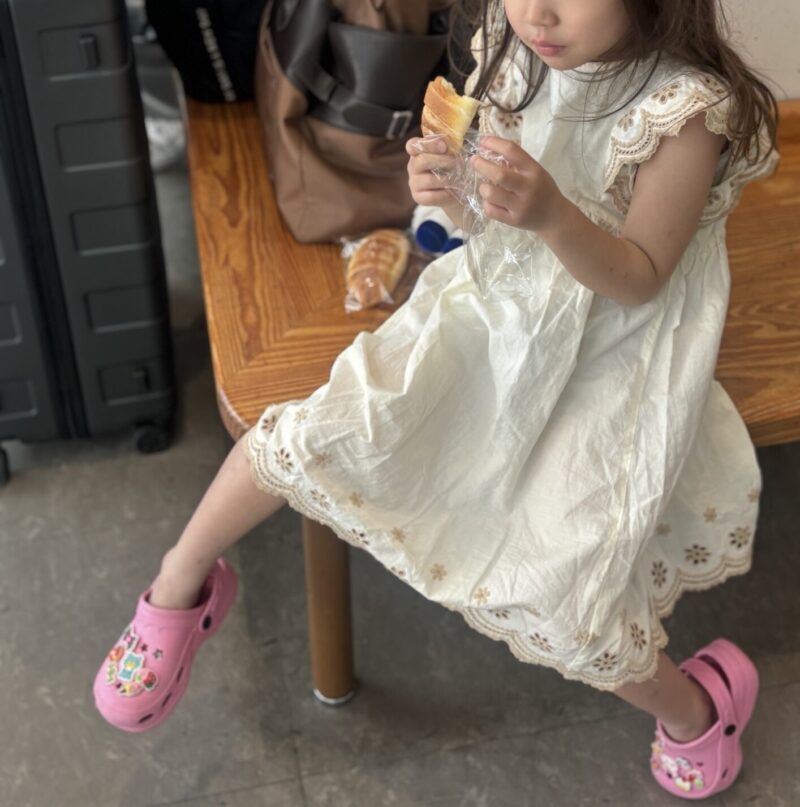 空港のベンチで食す娘。