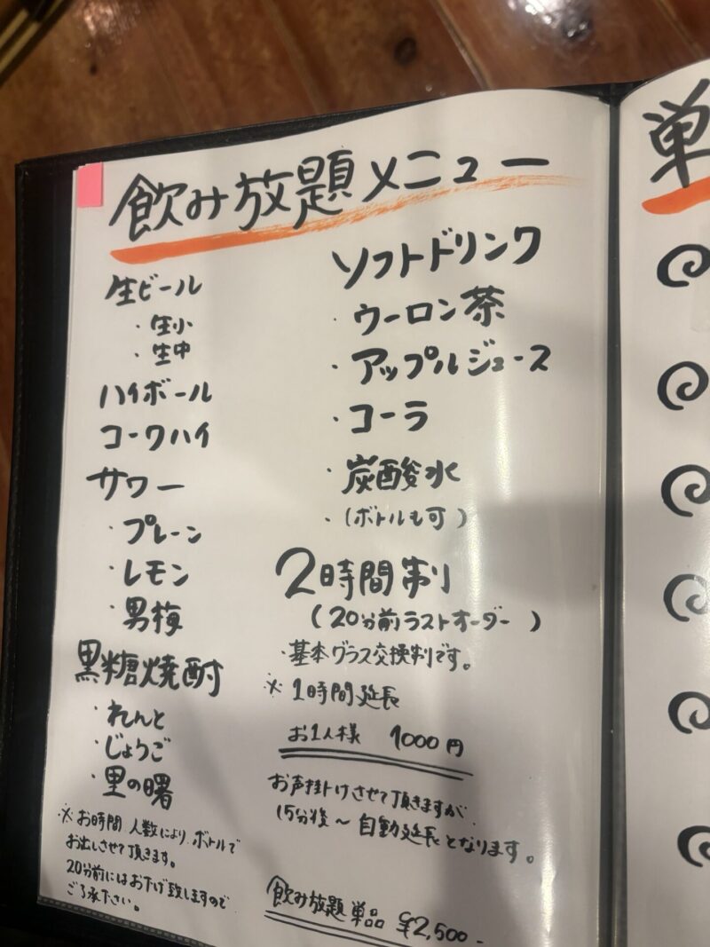 飲み放題で飲める黒糖焼酎は「れんと・じょうご・里の曙」の3種類。