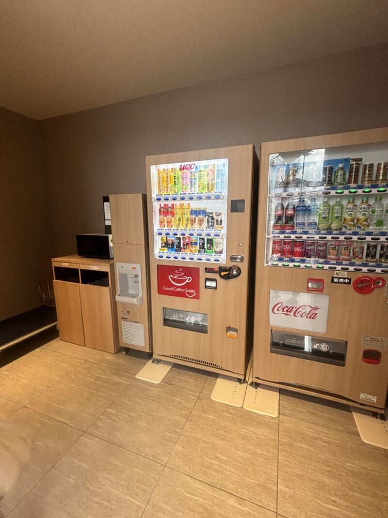 受付カウンター横にある自動販売機と電子レンジ、お湯がでる浄水器。