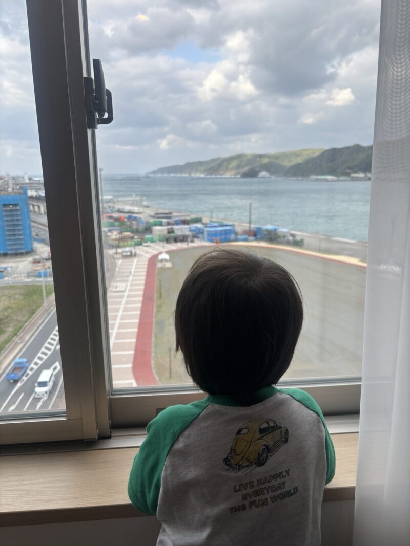 コンテナ船が入ってくる姿を眺めることができ、車好きの息子は大喜び。