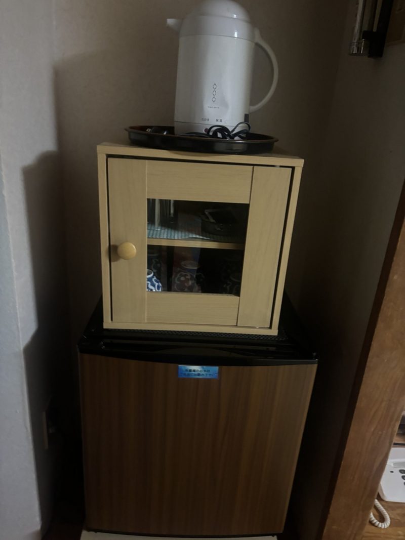 小さな冷蔵庫と湯沸かしポット、グラスや茶飲みが置いてありました。