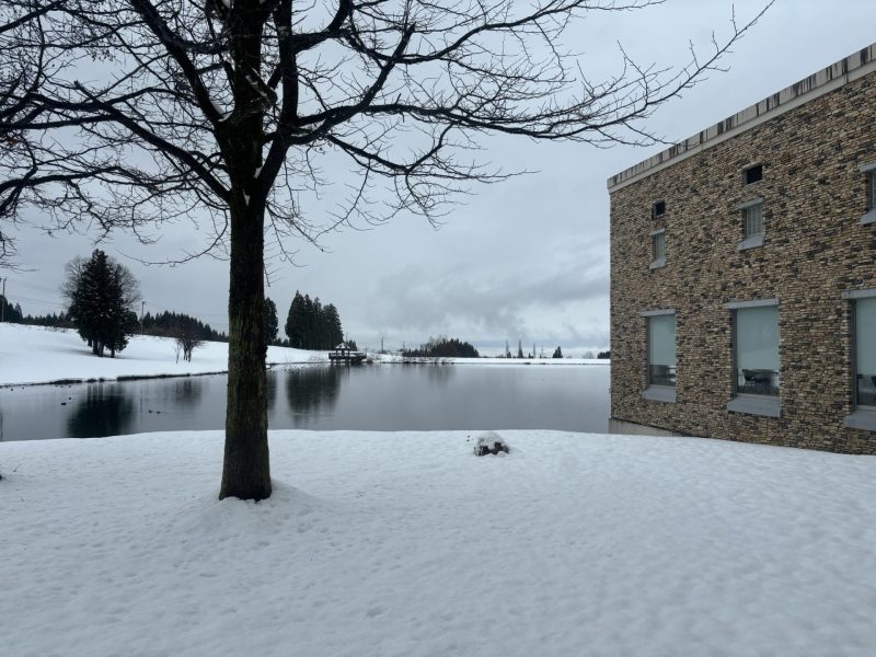 水に囲まれているので、晴れの日は太陽の日がキラキラ反射して、雨の日は水の音と水模様が幻想的に、冬は真っ白な銀色世界と季節や天候によって景色が変わっていくのだそう!