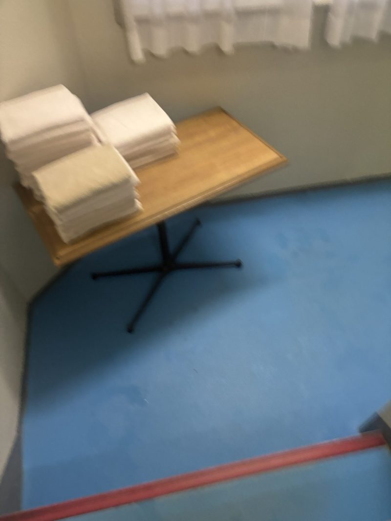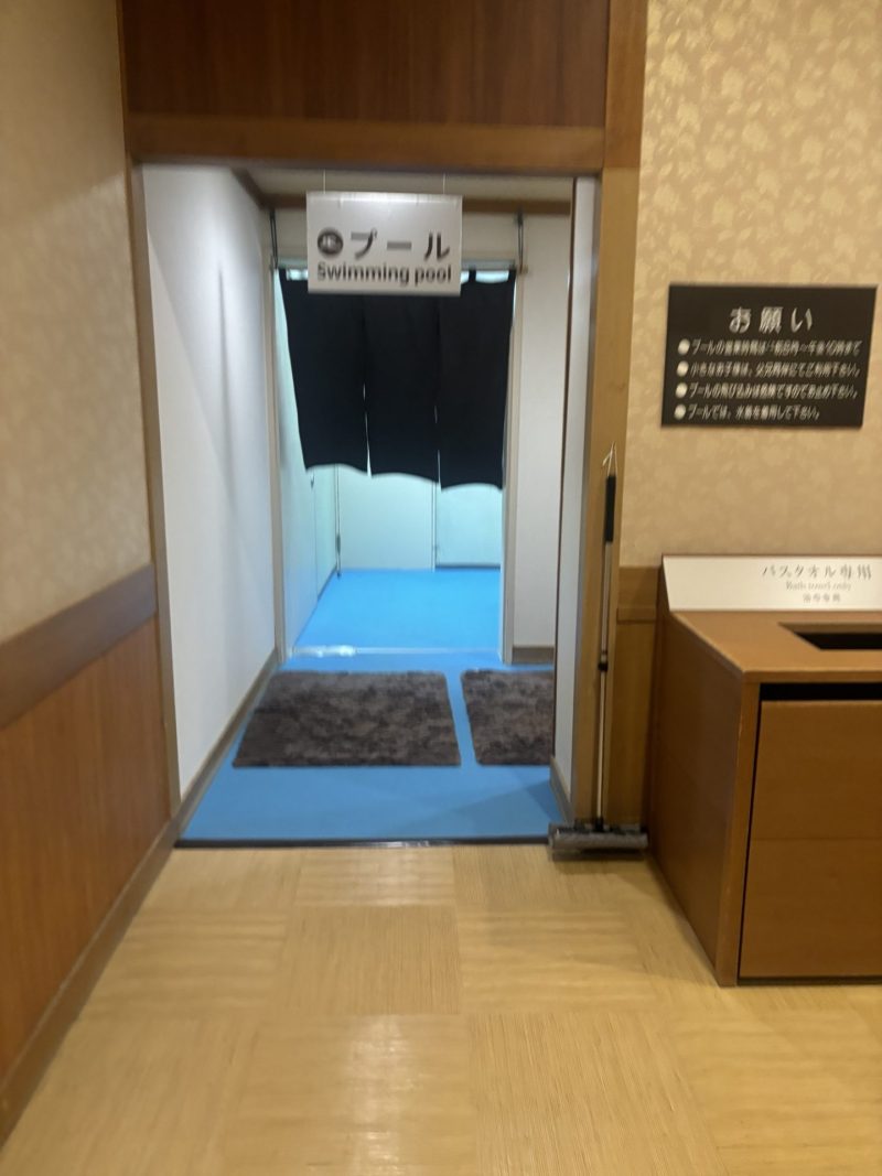 ボケボケの写真で申し訳ないのですが、タオルは大浴場のところで取らなくても、プール前の階段脇にも用意されていました。