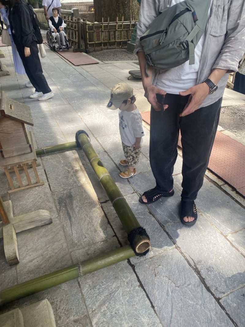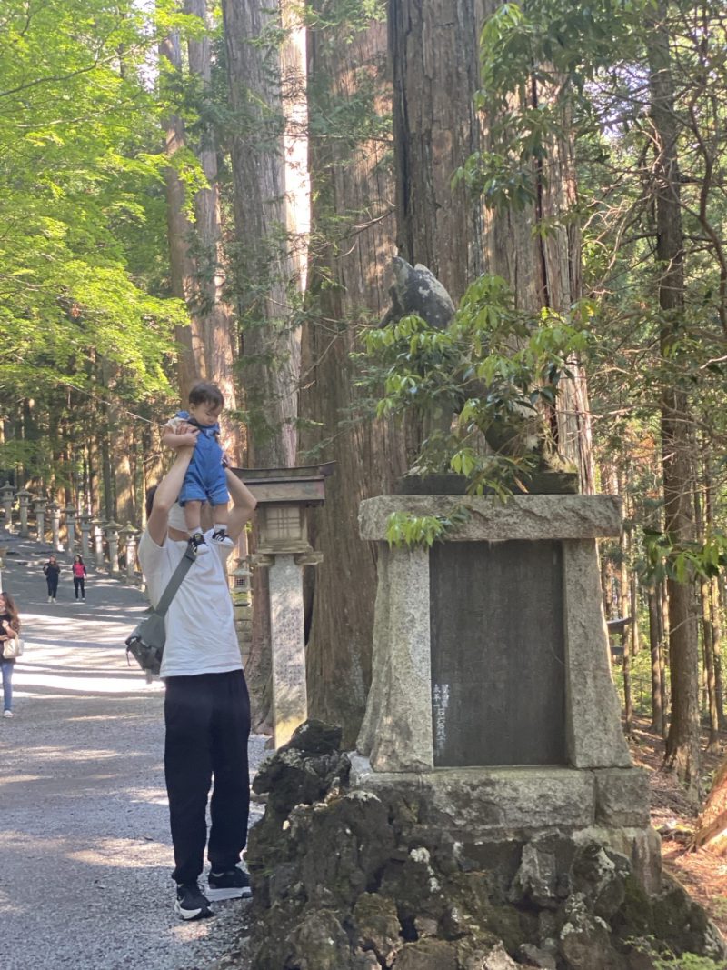 本殿までの途中にいるオオカミに挨拶をする息子(1歳)