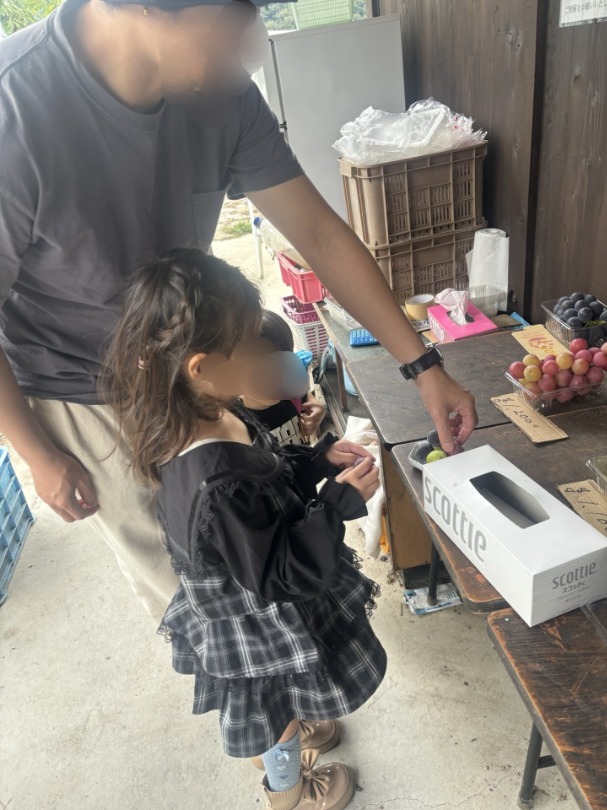 入るとおじいちゃんが出てきてくれて売られている「シャインマスカット」「クインニーナ」「巨峰」のそれぞれの試食を出してくれました。