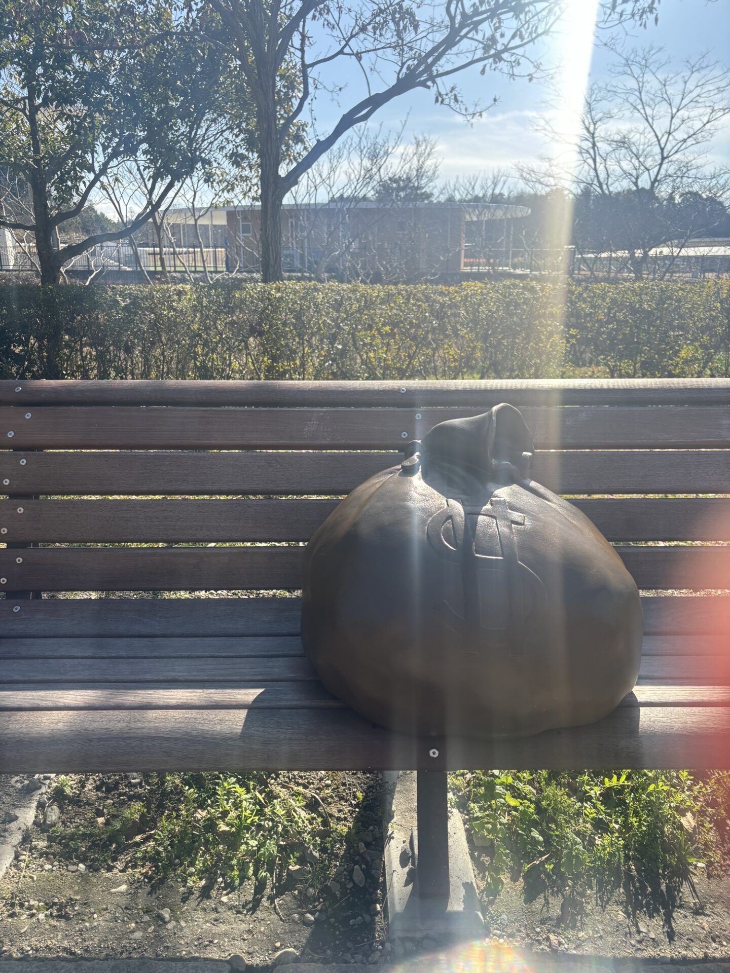愛・地球博記念公園内のベンチにはジブリキャラが置き忘れたアイテムをモチーフにしたオブジェが置かれています。全部探せなかったですが、これは割と無料エリアに置いてありました。
