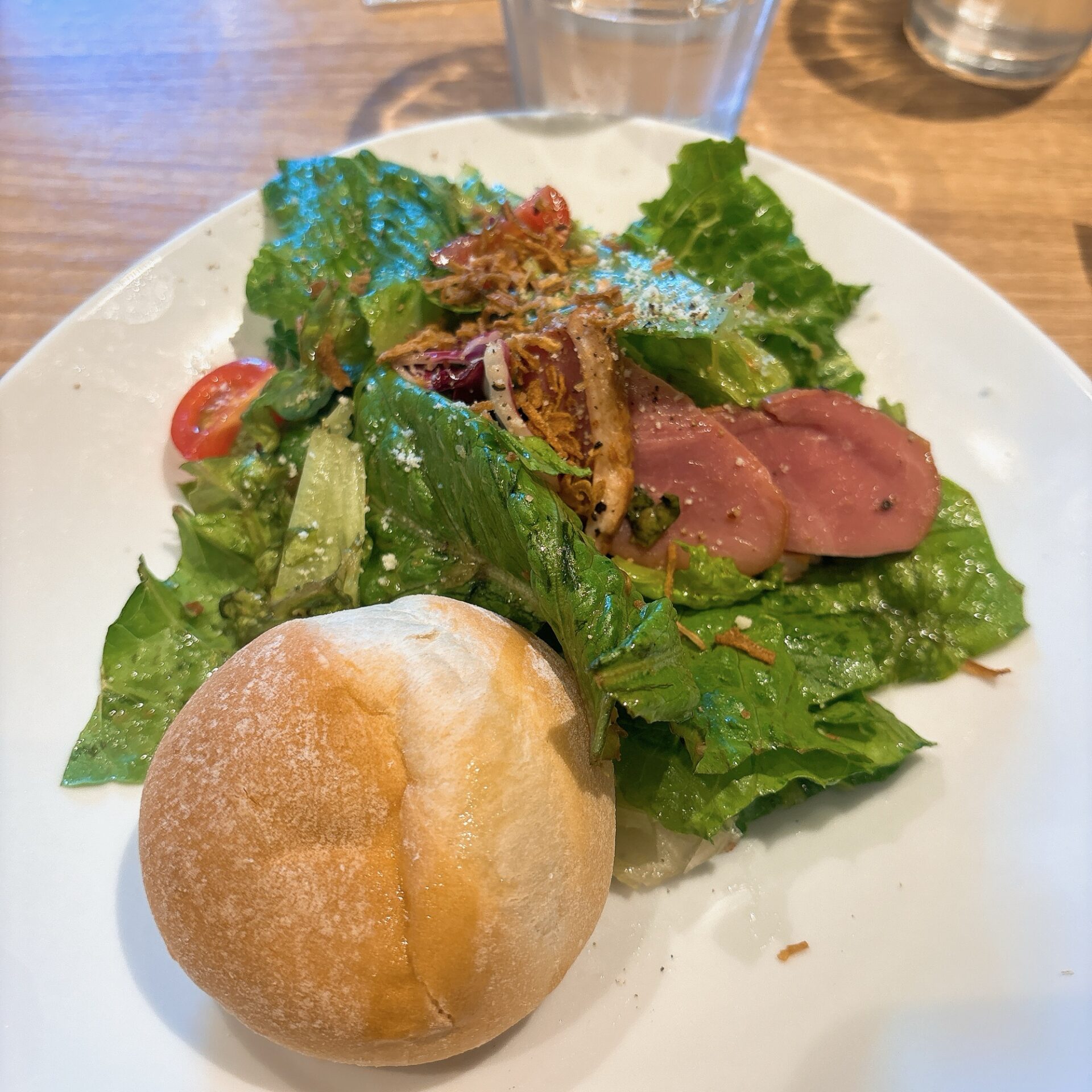 こちらがCセットのスープ+サラダ+パン。スープは今週はコーンスープでした。子供大喜びで奪い取られました(笑)丸パンももちもち系でとっても美味しい♡やわらかいので小さなお子さんでも食べれると思います。