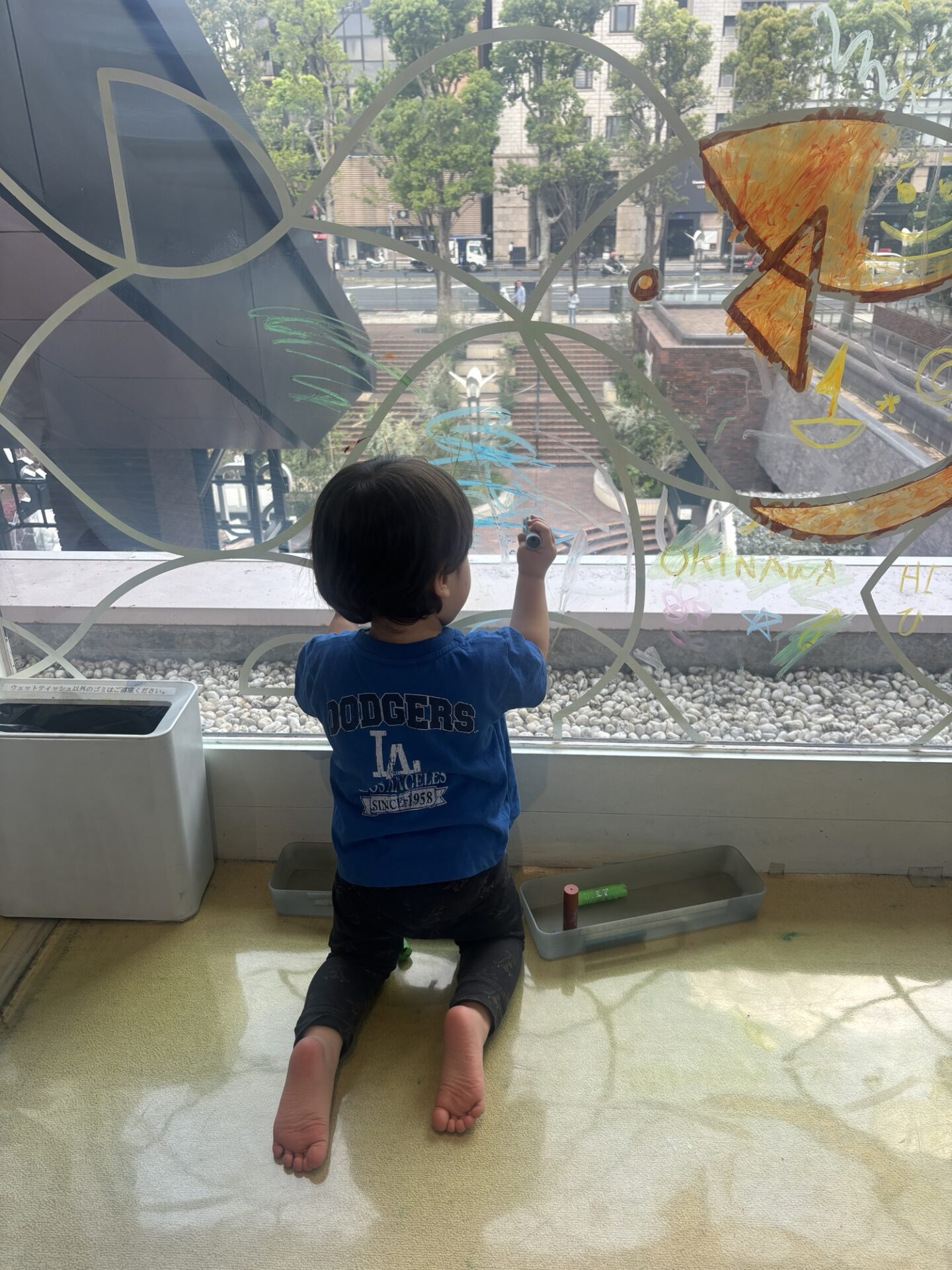 窓ガラスにクレヨンで絵をかけるスペースも。結構汚れるので白い服は着ていかないほうがよさそう。こんな広いキャンパスうれしいですよね。