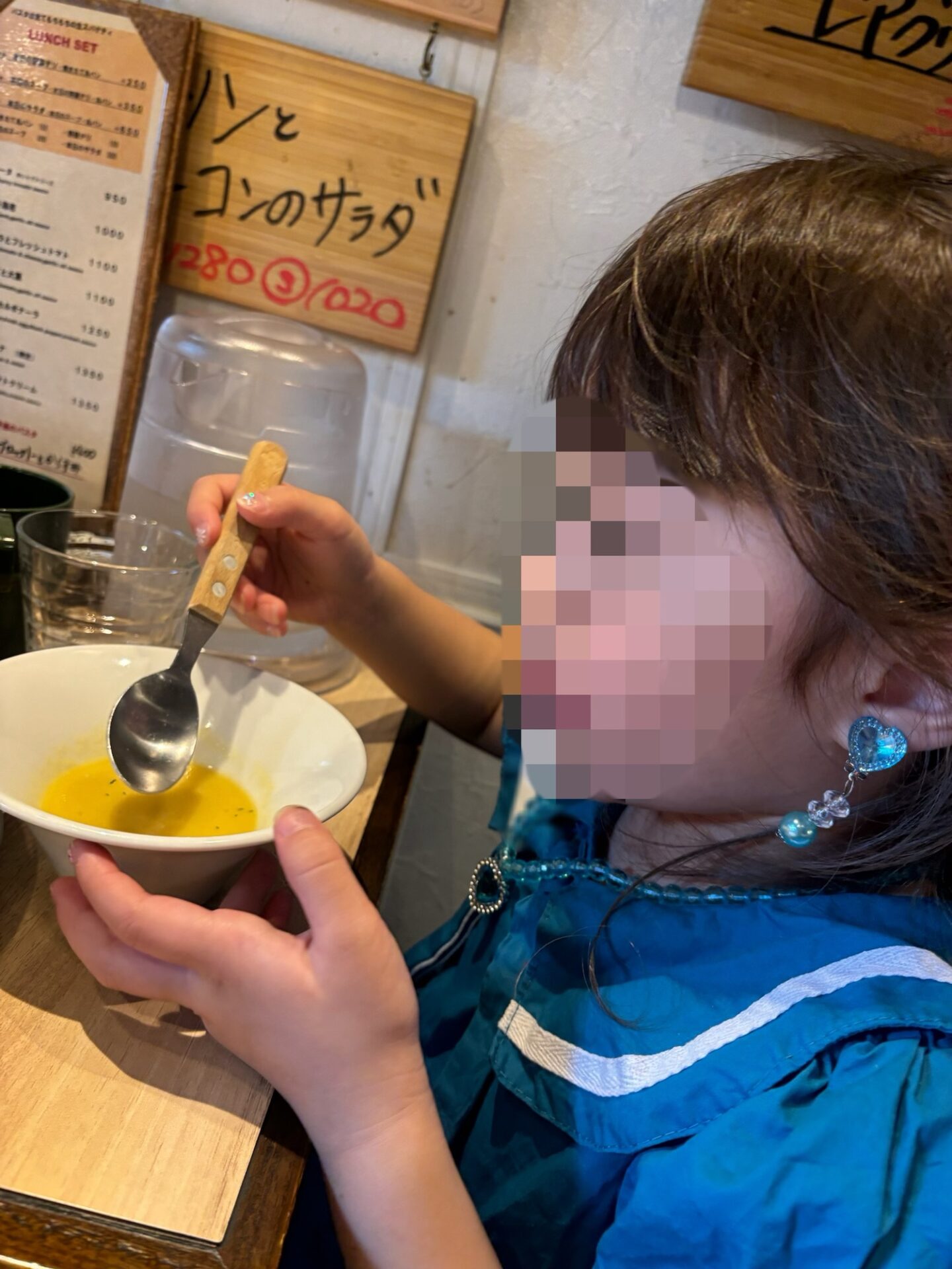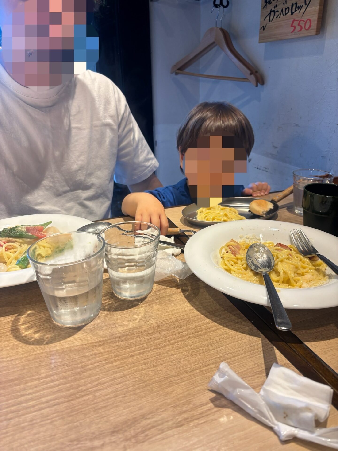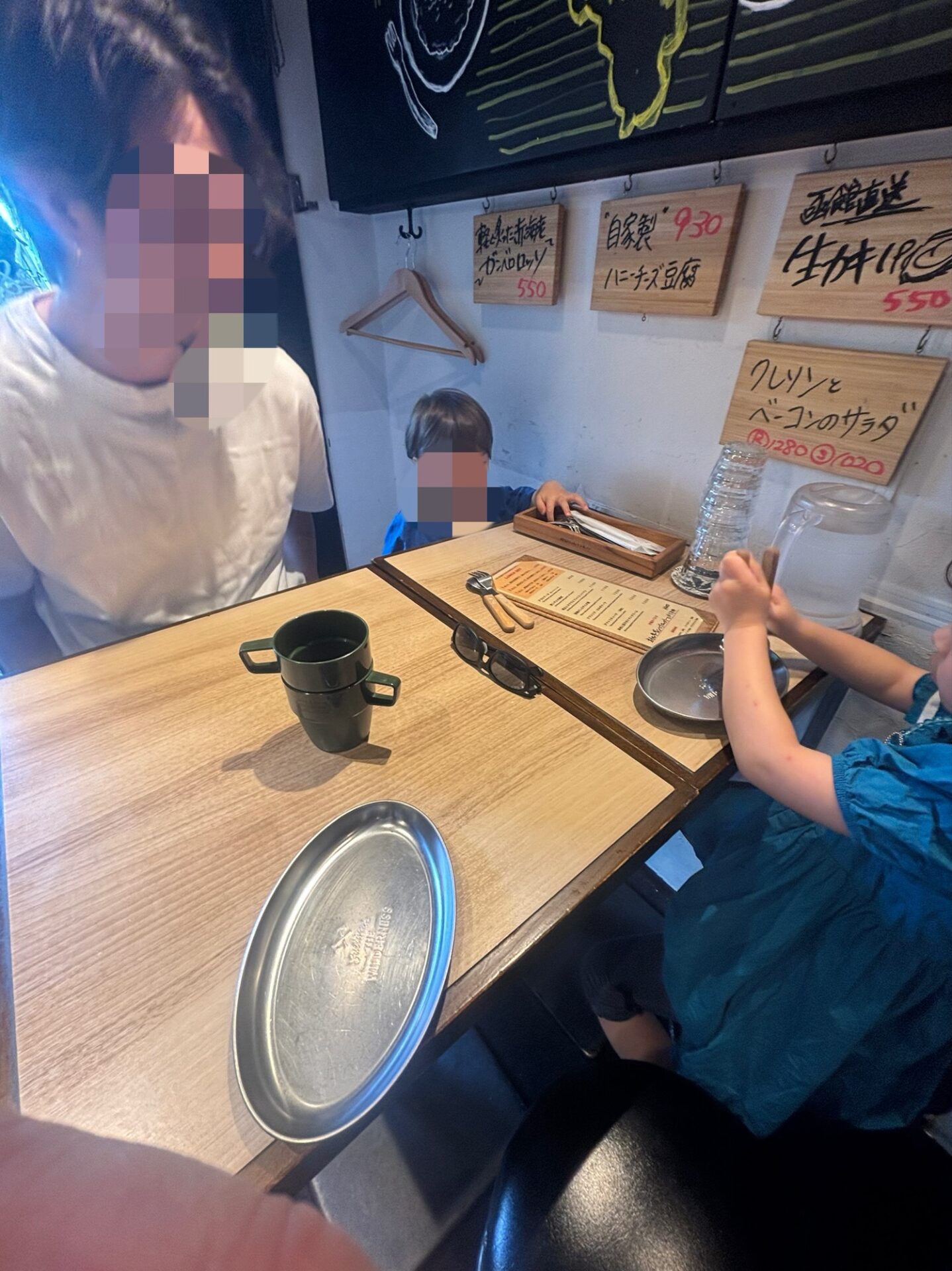 子供用の食器は用意されていました。下の子(2歳)は少し席が低く食べにくそうですが、本来大人用のお店なので当たり前ですね…。どんなところでも食べれるようになってほしいので本人からのSOSがない限り、自分で工夫しながら食べてもらってます。